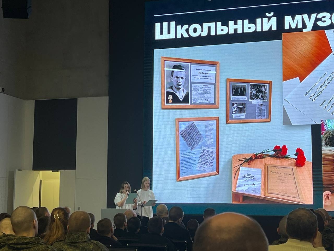 Наши ученицы рассказали об открывшейся в школьном музее экспозиции и проделанной поисковой работе Хранителей истории. Алексей Лебедев служил на подводной лодке Л-2 «Сталинец» и был принят в Союз писателей за свои сборники «Кронштадт» и «Лирика моря», что стало уникальным признанием для действующего военнослужащего. Он героически погиб 15 ноября 1941 года при выполнении боевого задания, спасая жизнь молодого матроса.