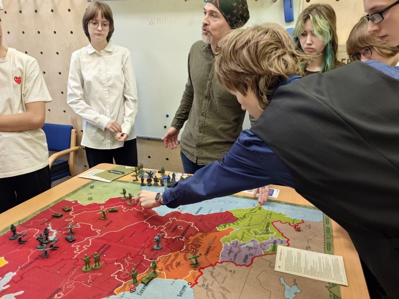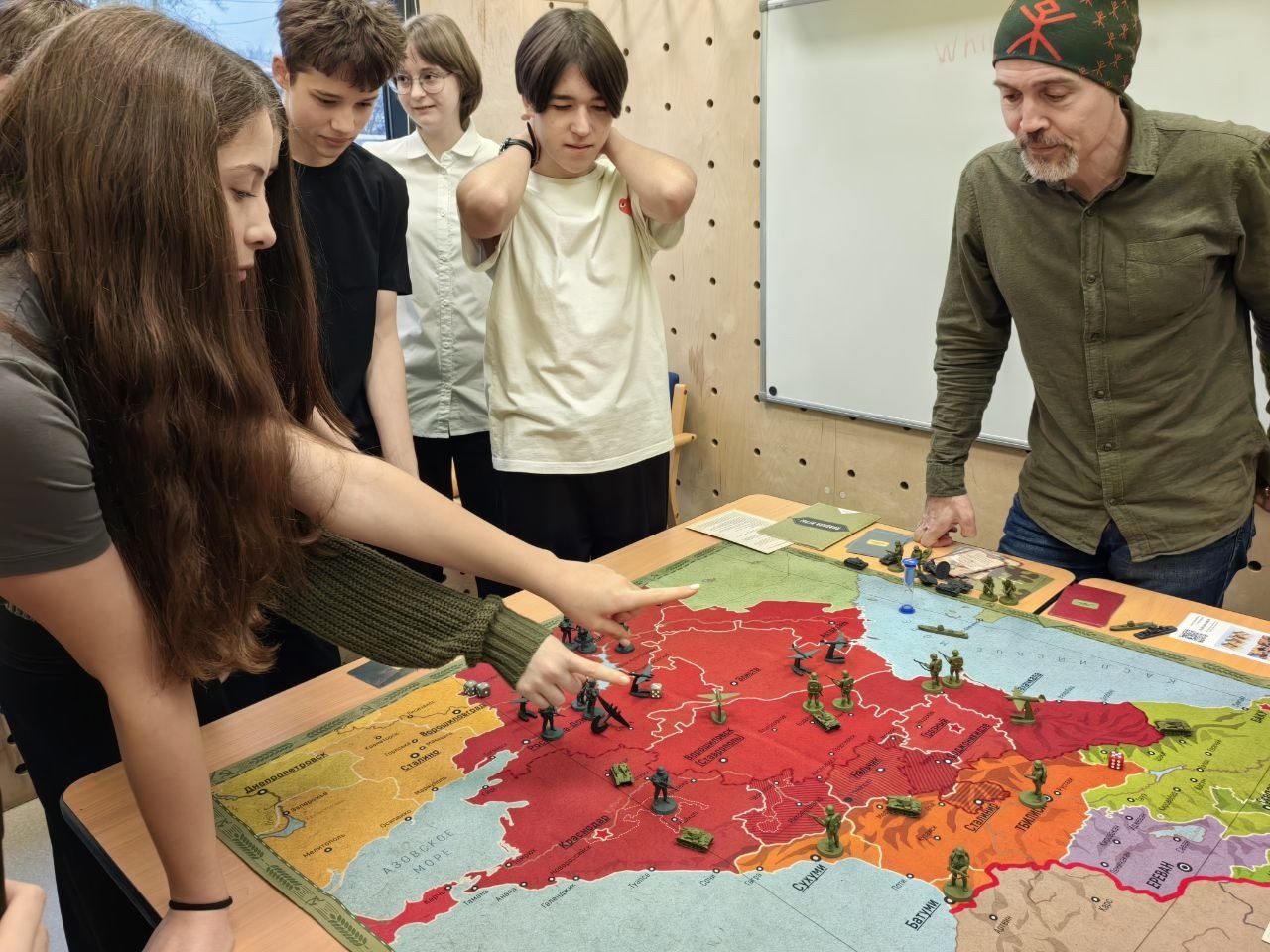 В игру были вовлечены все присутствующие. Временно незадействованные у карты игроки стали тружениками тыла и от их действий зависело количество подкреплений, которые получала наша армия.