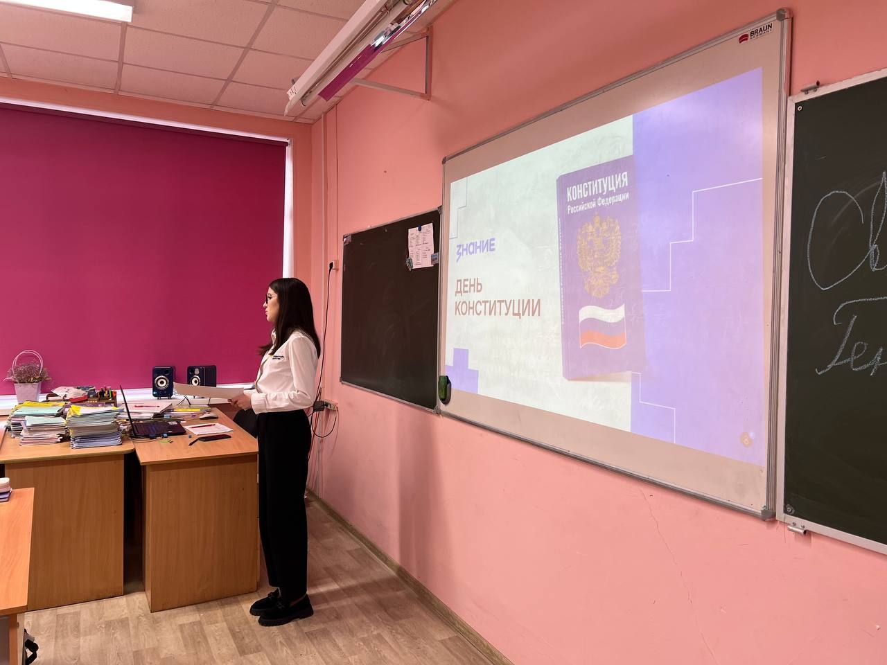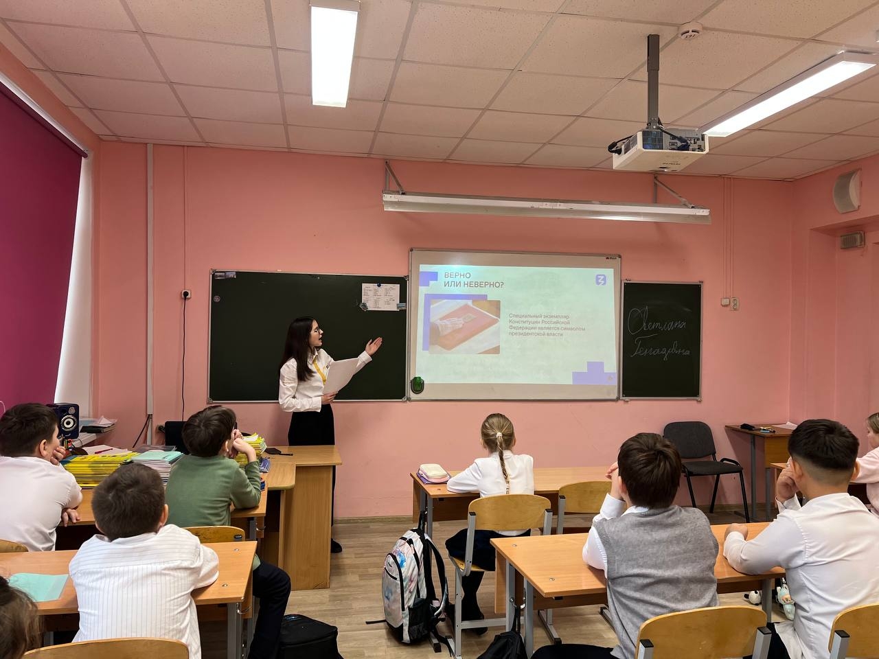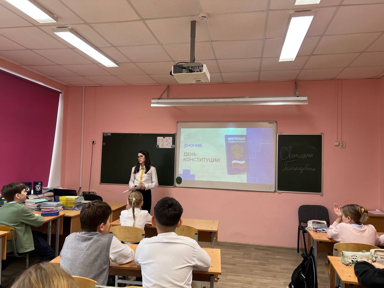 В преддверии этого праздника советник директора Светлана Геннадьевна Рузавина провела для учащихся интерактивный урок «День Конституции», где ребята узнали что защищает наши права, как устроена основа государства. Они узнали, почему Конституция — это не просто документ, а гарантия свободы, справедливости и стабильности в нашей жизни, и почему она касается каждого.