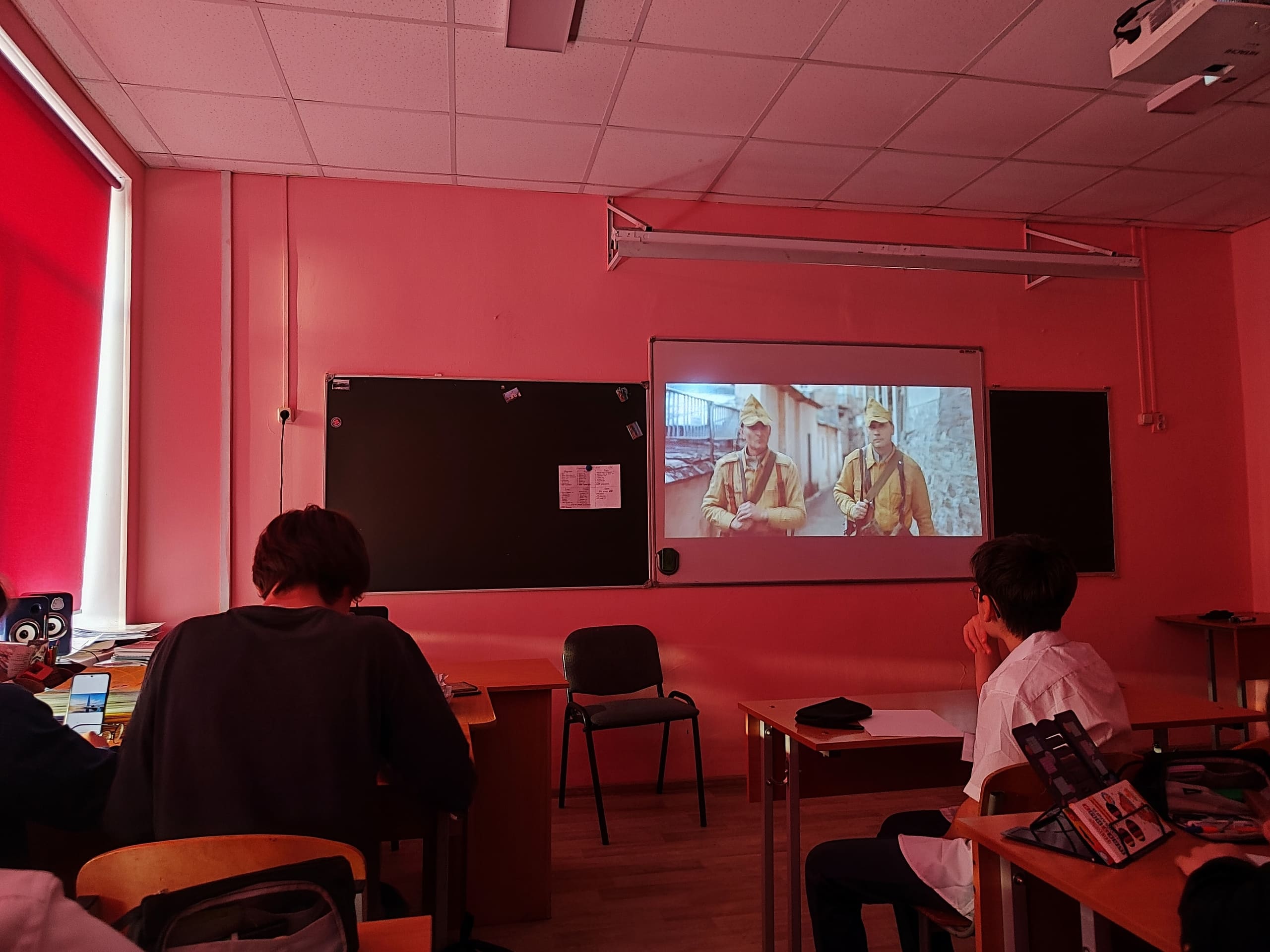 Ученики увидели художественный фильм «Красные ленты», снятый артековцами к 80-летию освобождения Крыма по легенде, которую хранят смотрители музея детского лагеря. В 1944-м году весь крымский полуостров был оккупирован, включая Артек, где фашисты беспощадно использовали детский труд. Каждый день местным ребятишкам приходилось тяжело работать под командованием немцев за скудный паёк. Невзирая на многочисленные издевательства, они выполняли всю грязную работу. Среди них и 13-летняя Надя, приглядывавшая за детьми немецкого офицера, с которыми девочка придумала игру - им нужно было раскрашивать ленточки в красный цвет, загадывать желание и вешать их на легендарное артековское Дерево желаний. А после, по ночам Надя исчезала в лесах Аю-Дага, чтобы передать разрисованные красные ленточки партизанам, и каждое утро оккупанты начинали с тревоги, поскольку на горе Аю-Даг виднелись партизанские красные флаги, которых становилось всё больше, и они поднимались всё выше. Немецкое командование стремилось изо всех сил устранить причину появления красных флагов и уничтожить партизан…